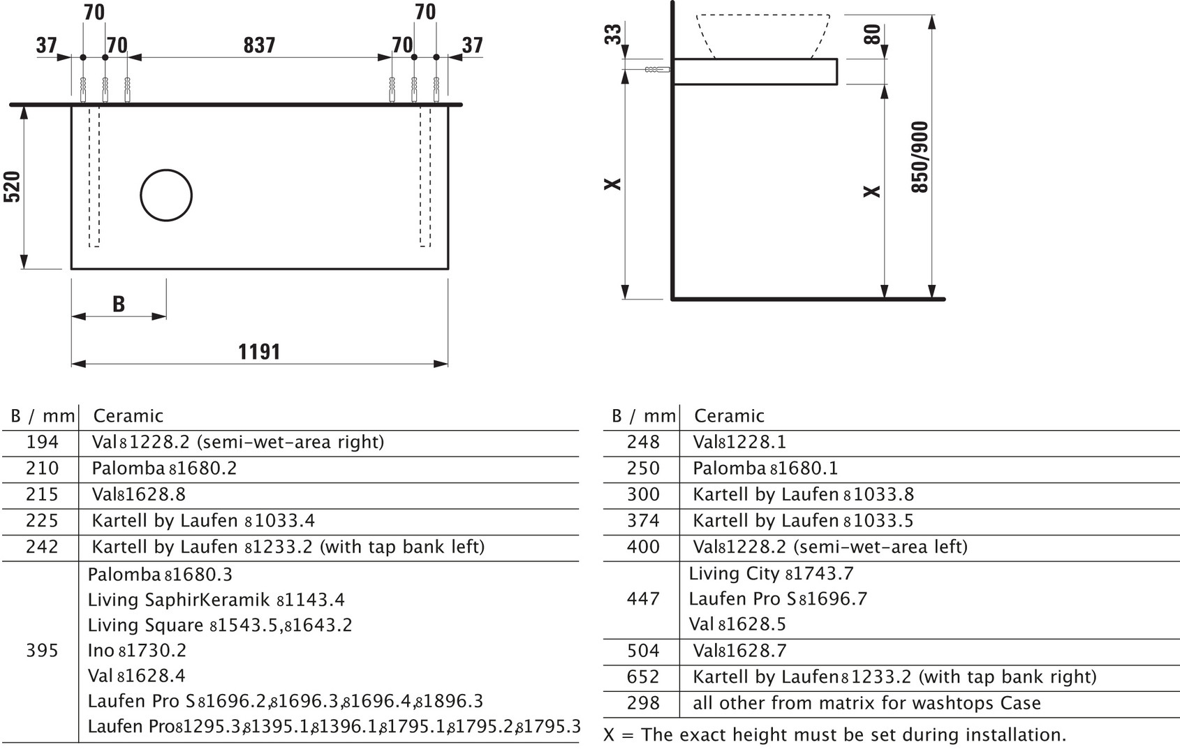 Laufen Waschtischplatte CASE 8x119x52cm, mit Ausschnitt zentriert, weiß W491558