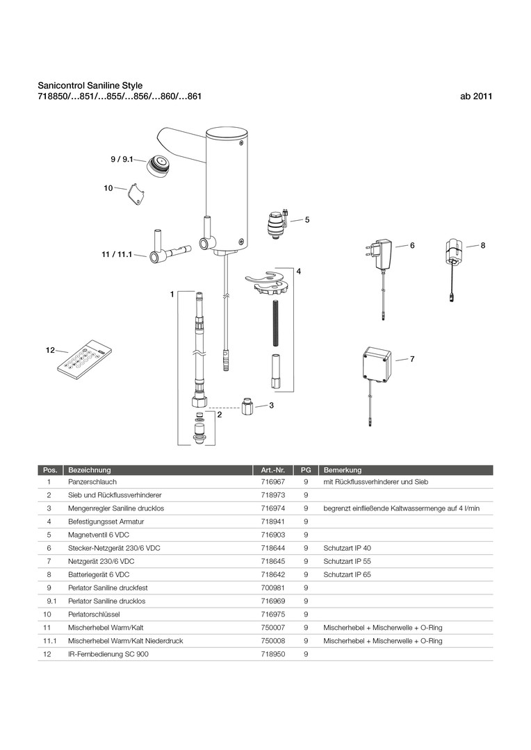 Waschtischarmatur mit Mischerhebel, für die Entnahme von kaltem und warmen Leitungswasser aus dem Trinkwassernetz, Einsatzbereich Innen, für drucklose Elektro-Speicher-Wassererwärmer, 142 x 151 x 53 mm, Ausladung 105 mm, für Lochstanzung Ø 35 mm, zur Montage auf Waschtisch oder Arbeitsplatte (Stärke 2-40 mm), aus Messing in chromglanz, Armaturengruppe I nach DIN EN 200, Schutzart IP 55, zur Standmontage, Durchflussbegrenzer 4,5 l/min, vandalensicher, Strahlregler M24 diebstahlgesichert, Infrarot-Näherungselektronik, bistabiles Magnetventil 6 V, Betriebsdruck 0,5-8 bar, max. Auslauftemperatur 60 °C, Nachlaufzeit einstellbar von 0,5-10 s (Werkseinstellung 1 s), automatischer Auslaufstopp einstellbar von 60-180 s (Werkseinstellung 60 s), zuschaltbare periodische Hygienespülung (einstellbar in 10 Intervallstufen von 24-240 h), Dauer Hygienespülung einstellbar von 30-120 s, Reinigungsstopp Dauer 60 s, einstellbare Funktionen über Sanicontrol-Fernbedienung SC 900 (Nachlaufzeit, Auslaufstopp, Hygienespülung, Ansprechbereich), für Edelstahlbecken geeignet, nachrüstbar, Temperatur über Mischerhebel einstellbar, ohne Ablaufgarnitur, nicht geeignet für druckfeste Durchlauferhitzer, bestehend aus 1x Armatur mit integrierter Infrarot-Näherungselektronik und Magnetventil, Befestigungsmaterial, 3x flexible Anschlussschläuche R 3/8 (Länge 400 mm), 1x Rückflussverhinderer, 1x Schmutzfangsieb, 3x Flachdichtungen 3/8", 1x Batteriegerät 6 VDC, Schutzart IP 65 (zur Montage unter dem Waschtisch), 4x Batterien Typ LR6 1,5 V, 1x Montageschlüssel für Strahlregler, 1x Sanicontrol-Fernbedienung SC 900