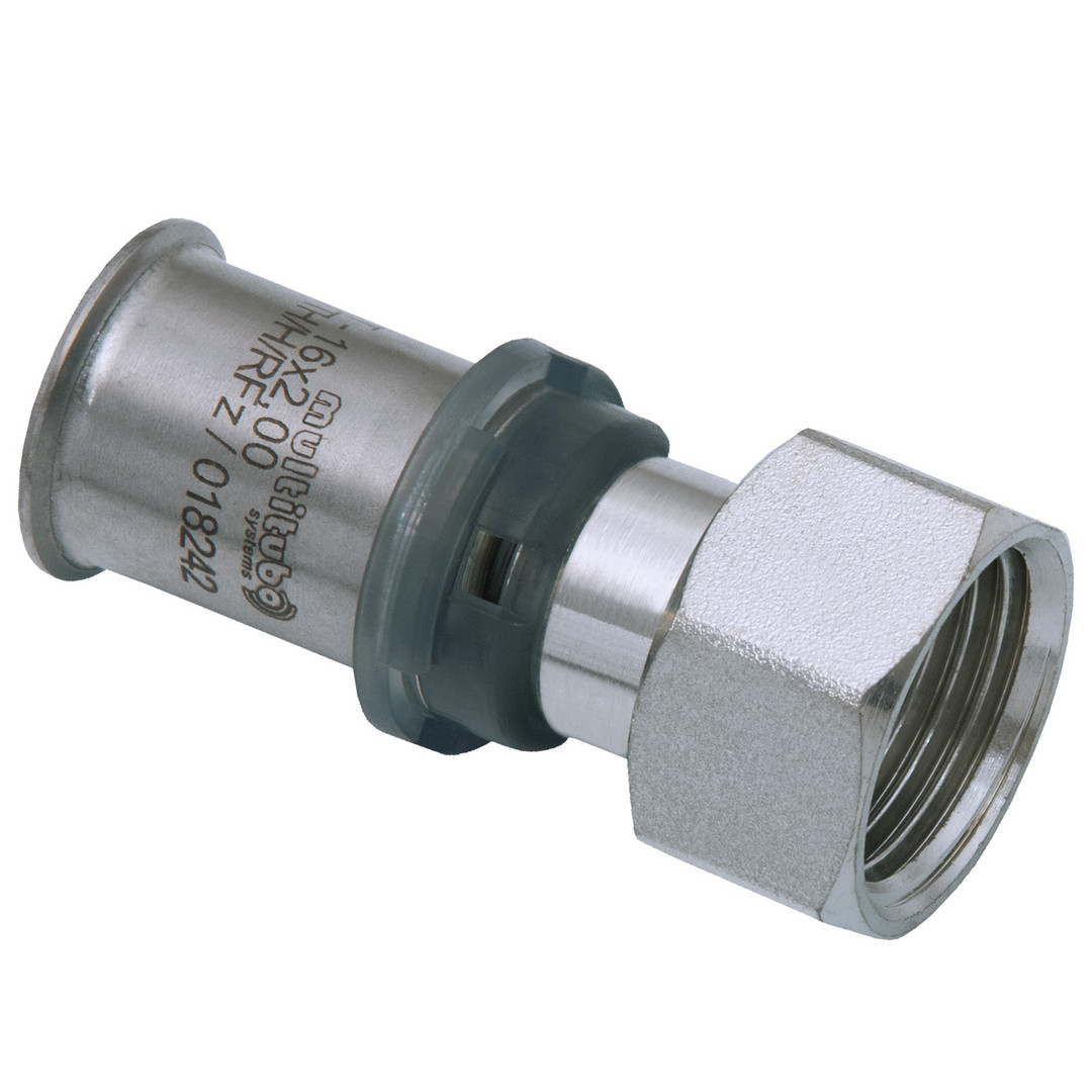 Presshülse mit doppeltem Pressbackenanschlag, Anschlagring aus transparentem, grauem Kunststoff mit Sichtfenster 360° zur Kontrolle der korrekten Einstecktiefe des Rohres, verbesserter Zetawert, unverpresst undicht, mit Überwurfmutter, zylindrisches Innengewinde nach DIN EN ISO 228-1, geliefert mit Flachdichtung, lösbare Verschraubung zum Anschluss, Aufputz von Apparaten und Armaturen, verpressbar mit U-/UP-, TH-, H- und RFz-Kontur