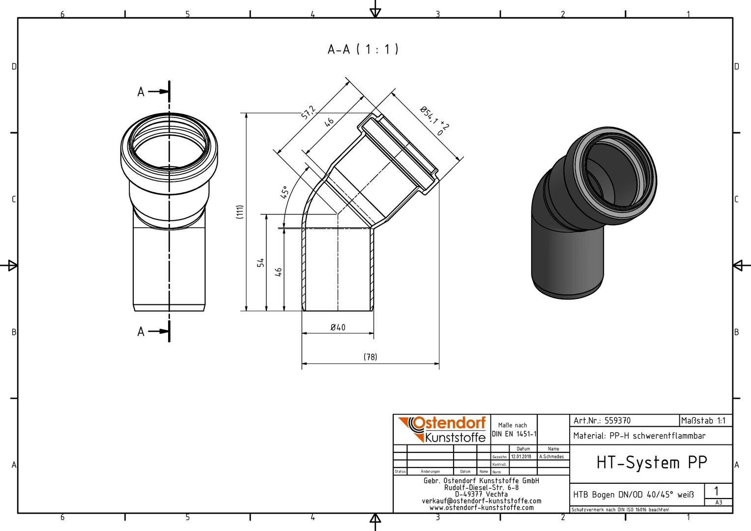 Ostendorf HT Bogen B DN 40, 45Grad, weiß