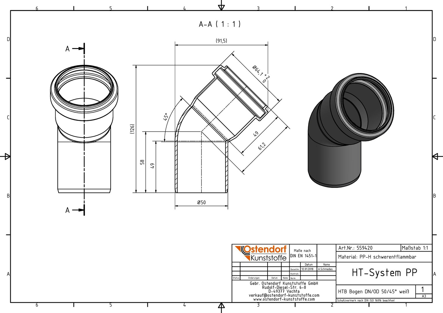 Ostendorf HT Bogen B DN 50, 45Grad, weiß
