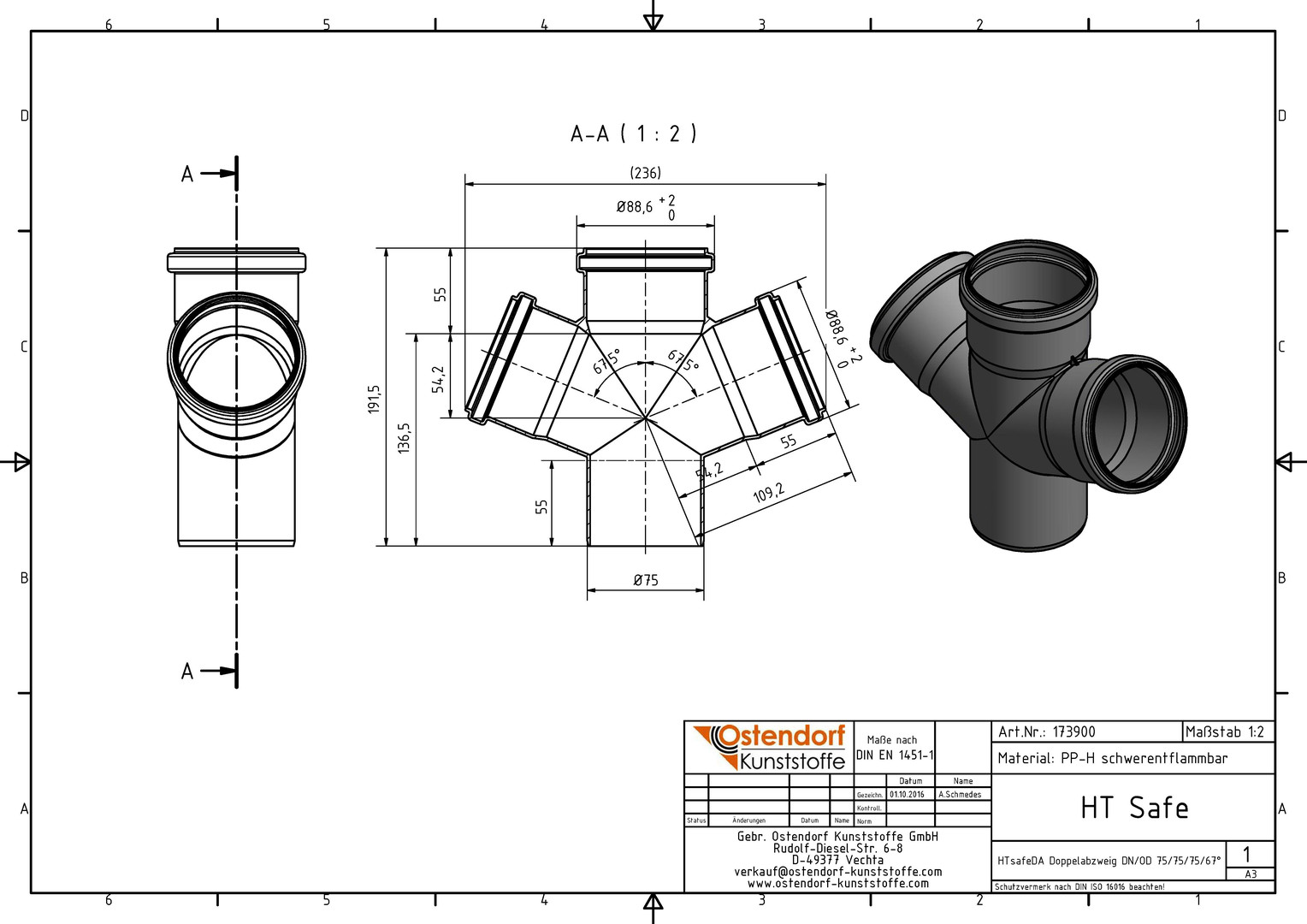 Ostendorf HTsafe Doppelabzweig DA DN/OD 75 x 75 x 75, 67,5Grad