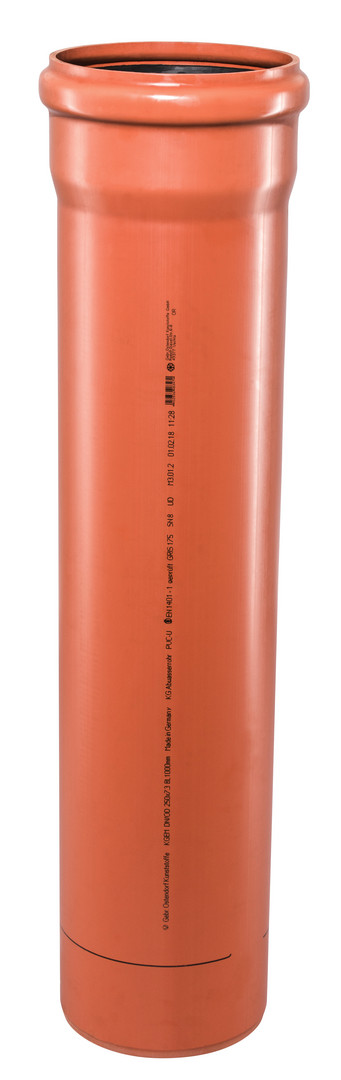 Vollwand, Anwendung für erdverlegte Abwasserkanäle und Leitungen, orangebraun RAL 8023, DIN EN 1401-1, geprüft nach GRIS GV 09 mit Gütezeichen Nr. 175, Ableitung von aggressiven Medien im Bereich pH 2-12