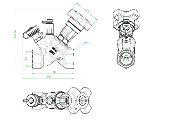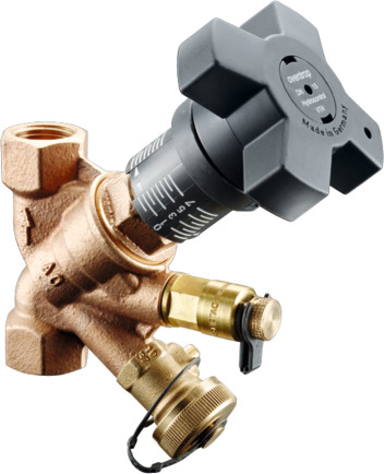 beiderseits Innengewinde nach EN 10226, voreinstellbar, Gewinde, Rotguss, PN 25 mit montiertem Anschluss-Set 3= 1 Messventil G 1/4 und 1 F+E Kugelhahn G 1/4