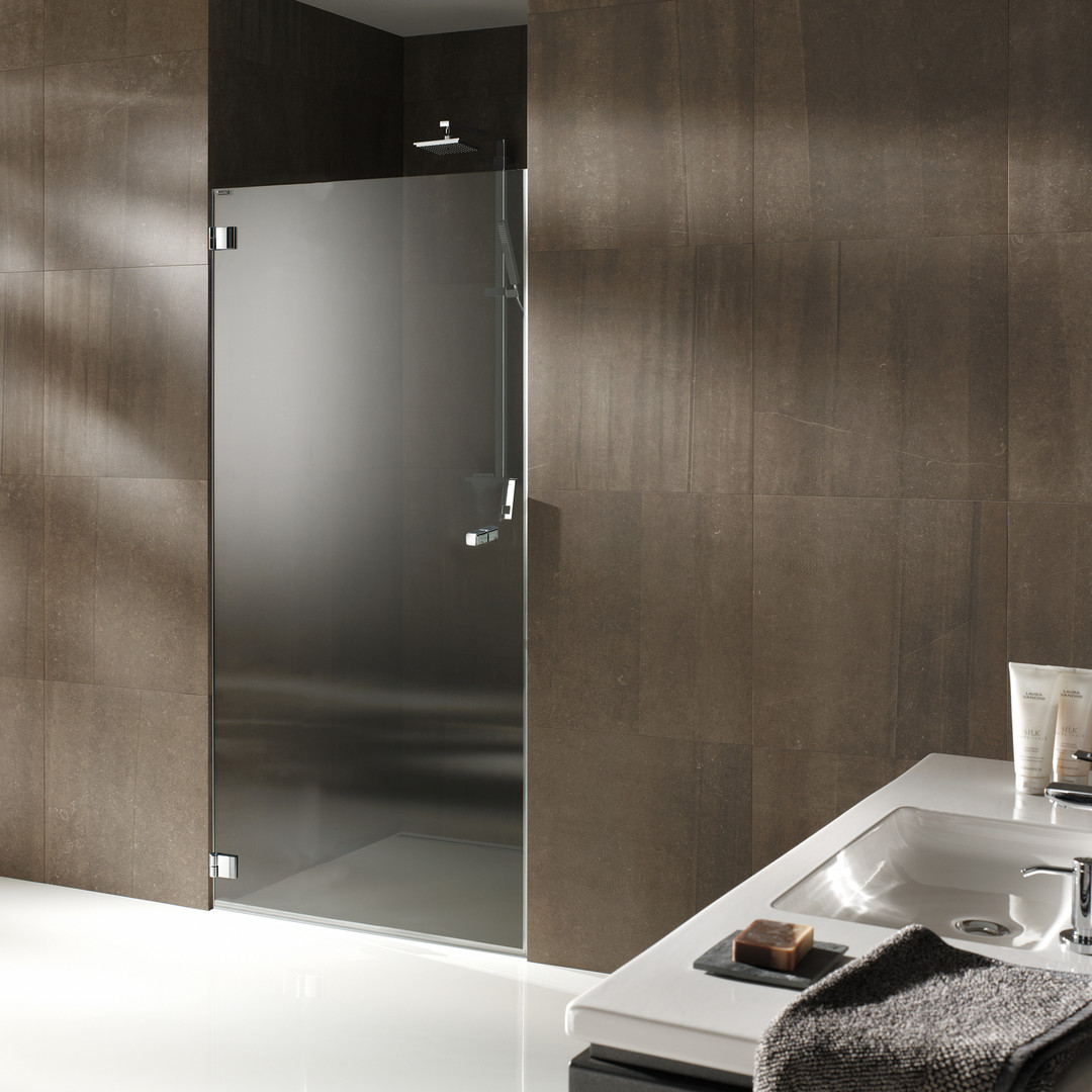 Glas 6 mm ESG transparent, Standardhöhe 2000 mm, Drehtüren öffnen nach außen, mit innen flächenbündigen Beschlägen, PALM.free, PALM. fix, PALM.lift, PALM.isi-clean, optional PALM.nano, PALM.care, punktuelle Wandbefestigung mittels Beschläge