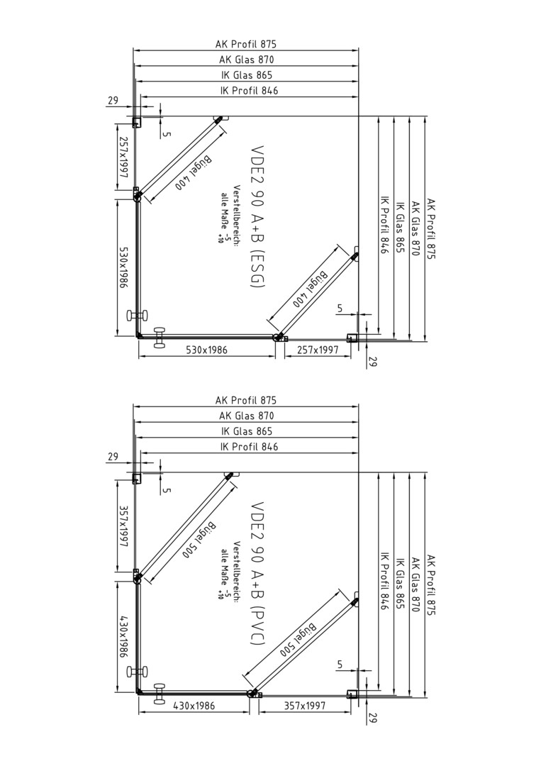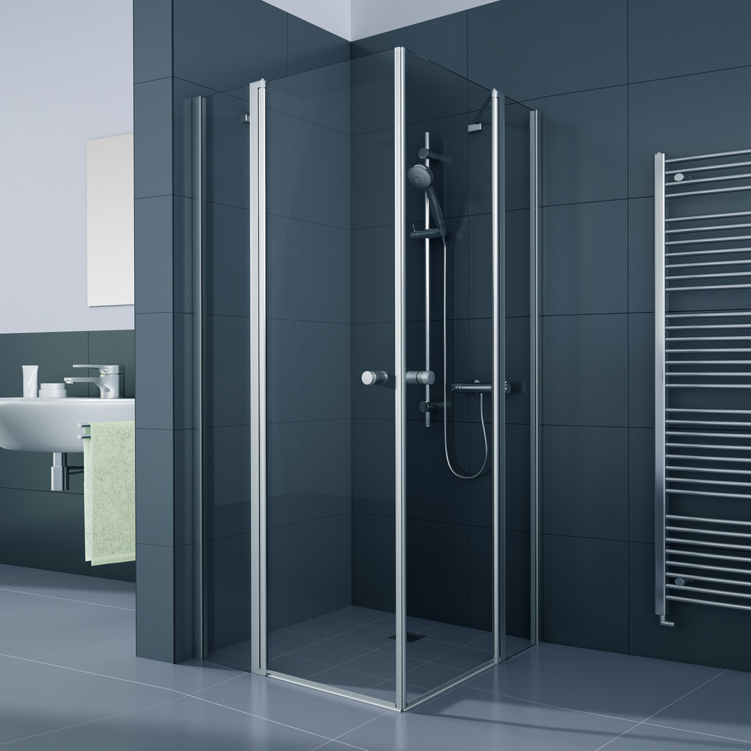Glasstärke Fixteile 5 mm, Türelemente 4 mm, Echtglas (ESG), Höhe 2000 mm, Pendeltüren öffnen nach innen und außen, Wandschiene Verstellbereich 15 mm, PALM.free, PALM.lift, PALM.fix, PALM.isi-clean, PALM.nano