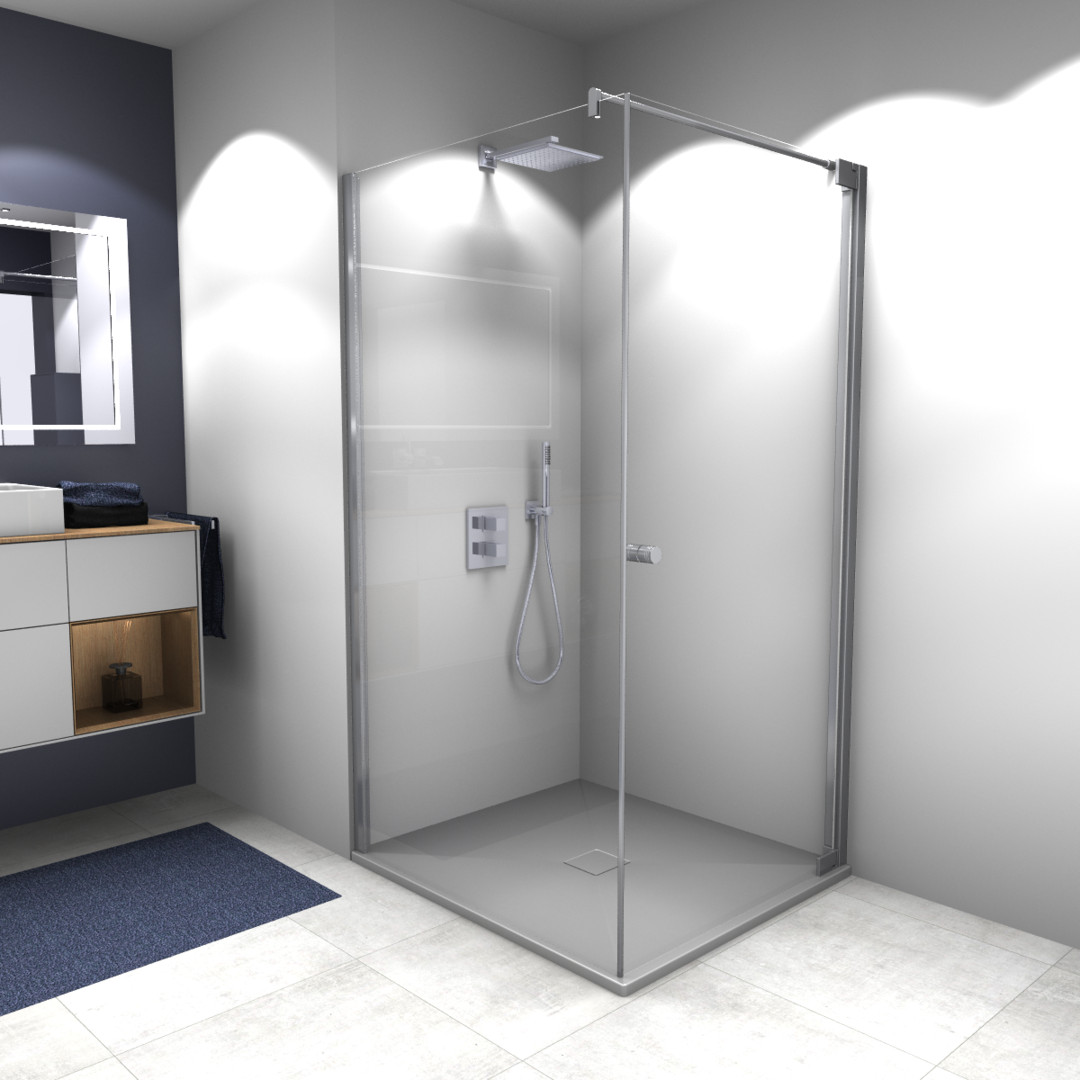 Glas 8 mm ESG, Standardhöhe 200 cm, Tür öffnet nach Innen und Außen, bodeneben, ohne Schwallschiene, PALM.fix, PALM.lift, PALM.free, PALM.isi-clean, optional: PALM.nano, PALM.care