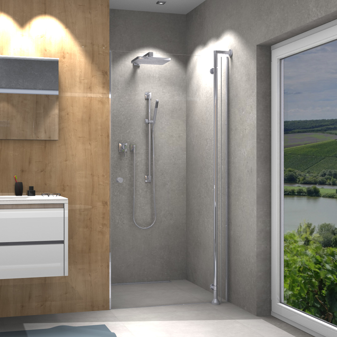 Befestigung außen, Glas 8 mm ESG transparent, Standardhöhe 2000 mm bzw. plus 55 mm Verstrebung, Tür öffnet nach innen und außen, mit flächenbündigen Beschlägen, Kombination mit Tube Accessoires möglich, Montage auf Fliesenboden oder auf Tube Duschwanne, PALM.free, PALM.fix, PALM.lift, PALM.pro, PALM.invisible, PALM.isi-clean, optional PALM.nano, PALM.care, PALM.magic