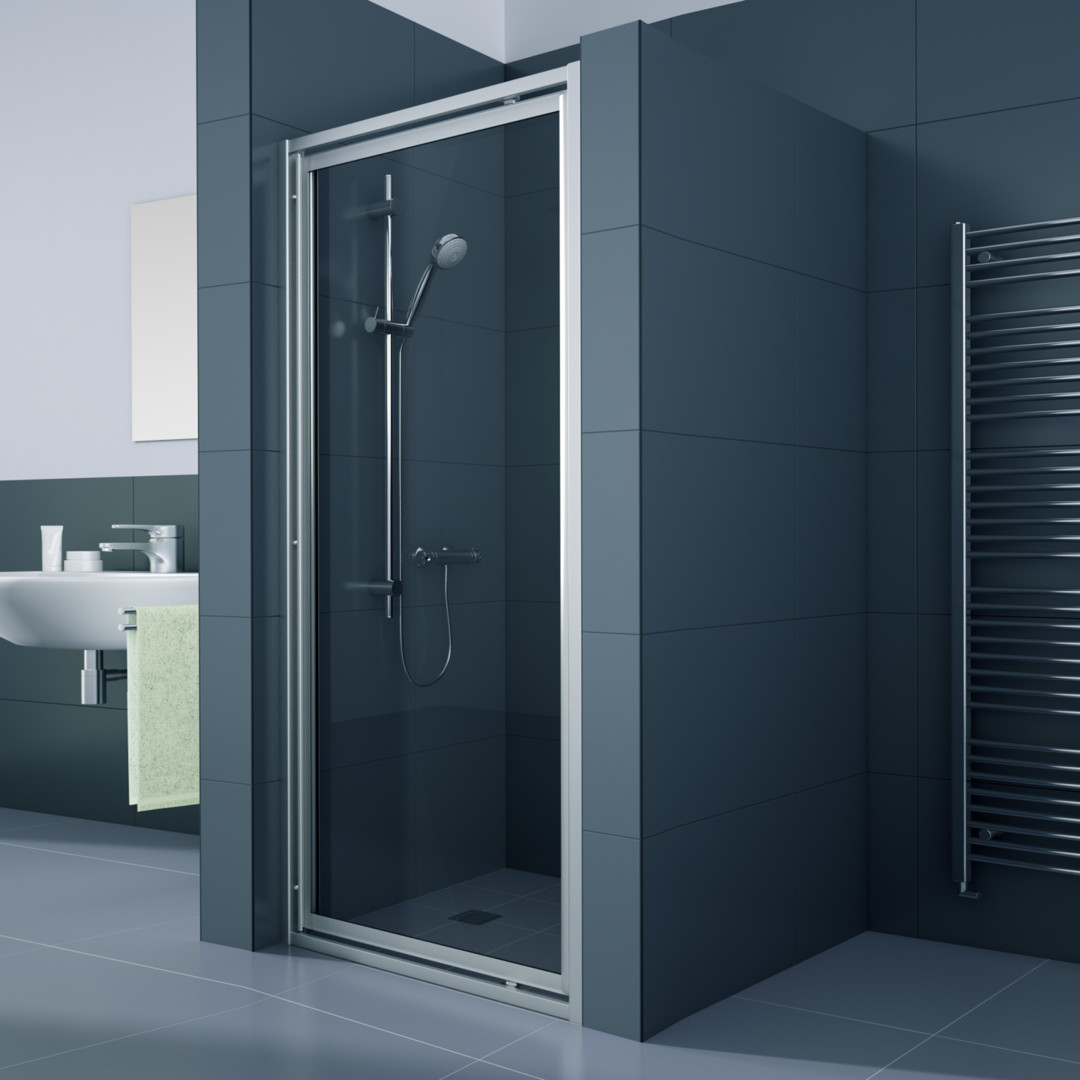 in Nische und zu Seitenteil, Glasstärke 3 mm, Echtglas (ESG), Höhe 2000 mm, Pendeltüren öffnen nach innen und außen, Anschlag links und rechts möglich (reversibel), Wandschiene 15 mm, Verschlussseite kein Verstellbereich, PALM.fix, PALM.isi-clean, PALM.nano