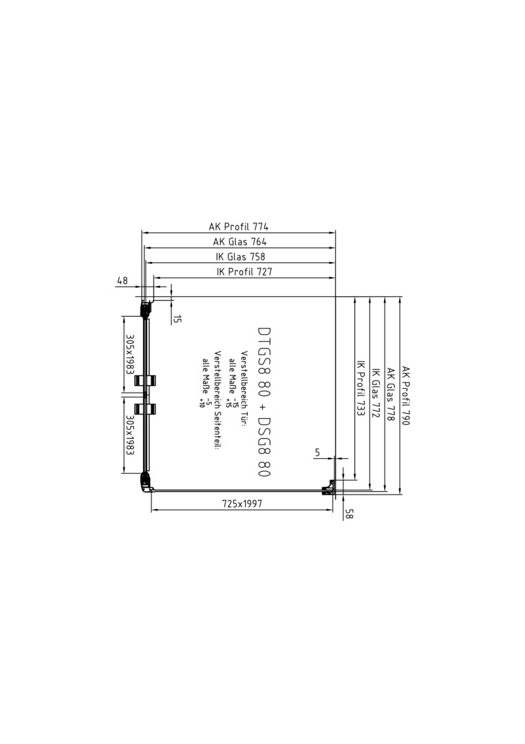 | Einbaubreite Tür für die Montage mit Seitenwand | 785 - 815 mm |