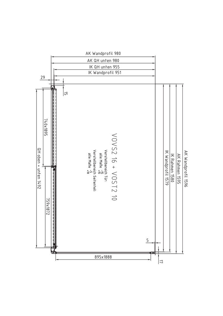 | Einbaubreite Tür für die Montage mit Seitenwand | 1585 - 1615 mm |