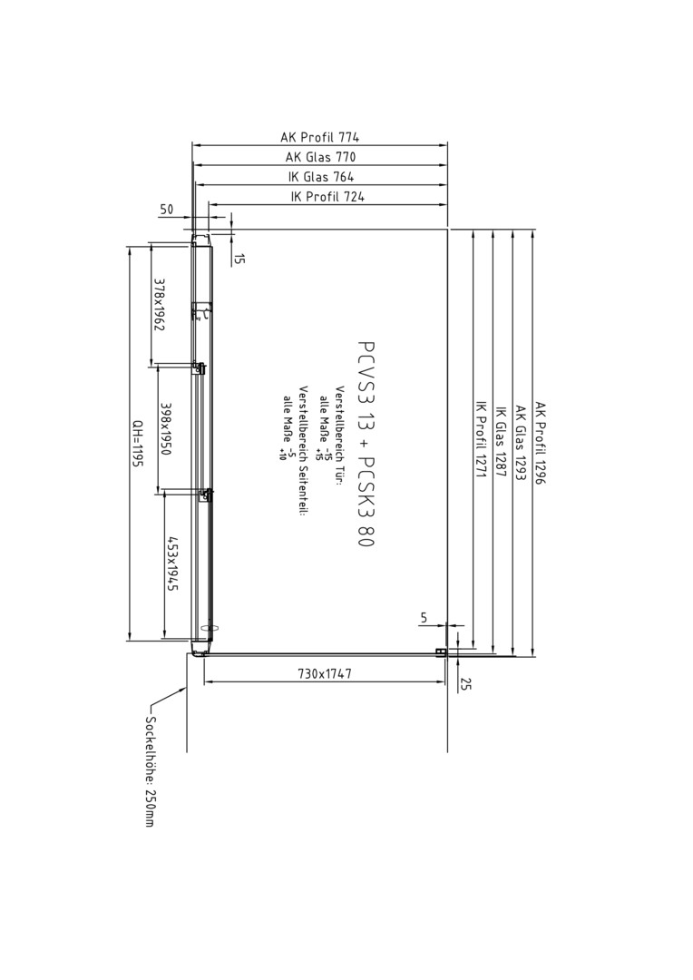 | Einbaubreite Tür für die Montage mit Seitenwand | 1285 - 1315 mm |