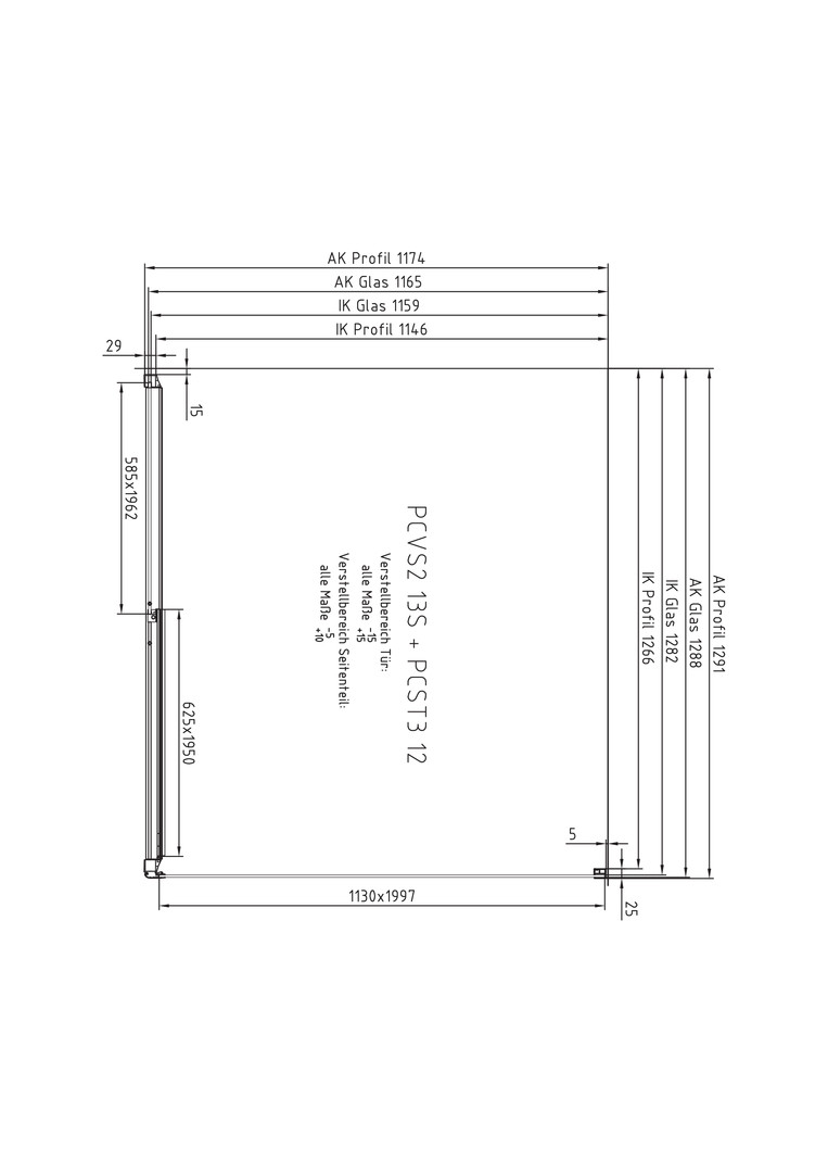 | Einbaubreite Tür für die Montage mit Seitenwand | 1285 - 1315 mm |