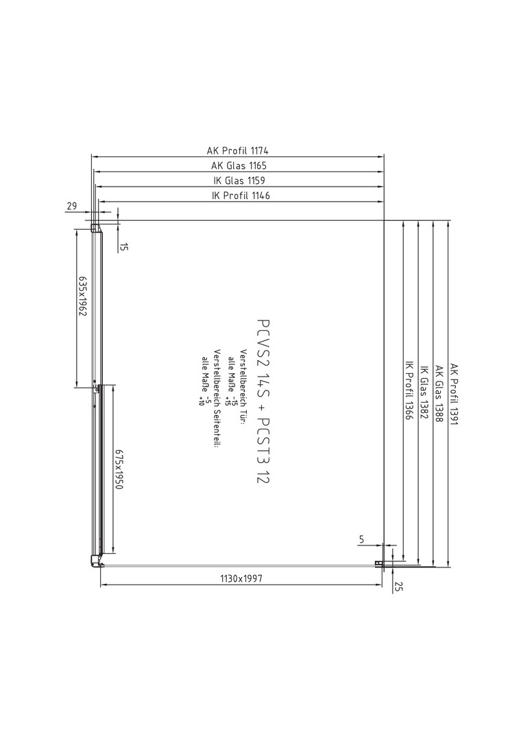| Einbaubreite Tür für die Montage mit Seitenwand | 1385 - 1415 mm |
