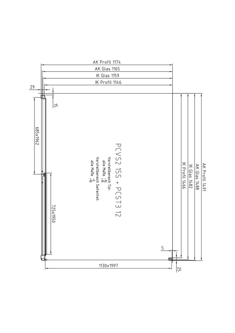 | Einbaubreite Tür für die Montage mit Seitenwand | 1485 - 1515 mm |