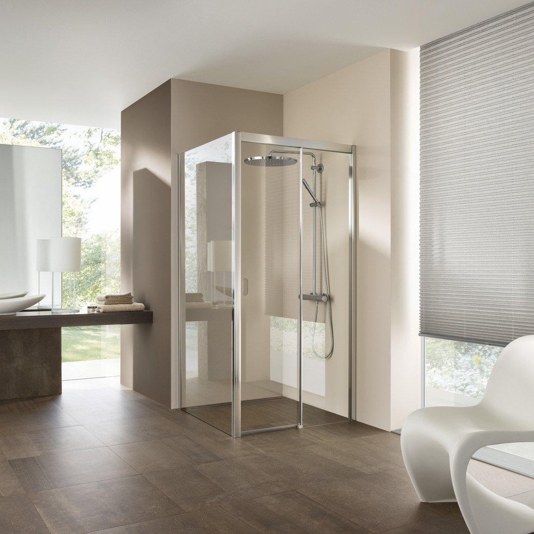 Glas 6 mm ESG transparent, Standardhöhe 2000 mm, Schiebeelemente ein Teil fest, ein Teil verschiebbar, optional mit Bodenleiste (Wasserschwallleiste), PALM.free, PALM.fix, PALM.lift, PALM.motion, PALM.soft, PALM.isi-clean, optional PALM.nano, PALM.care