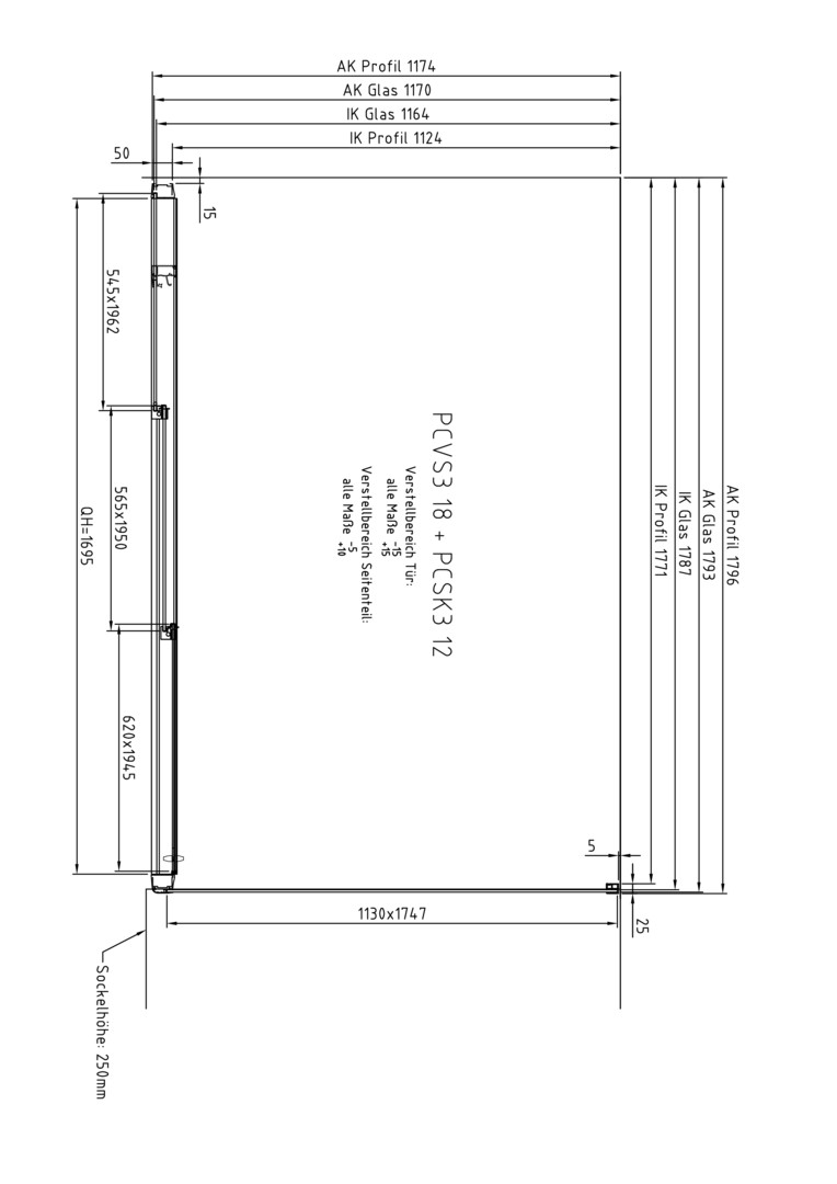 | Einbaubreite Tür für die Montage mit Seitenwand | 1785 - 1815 mm |