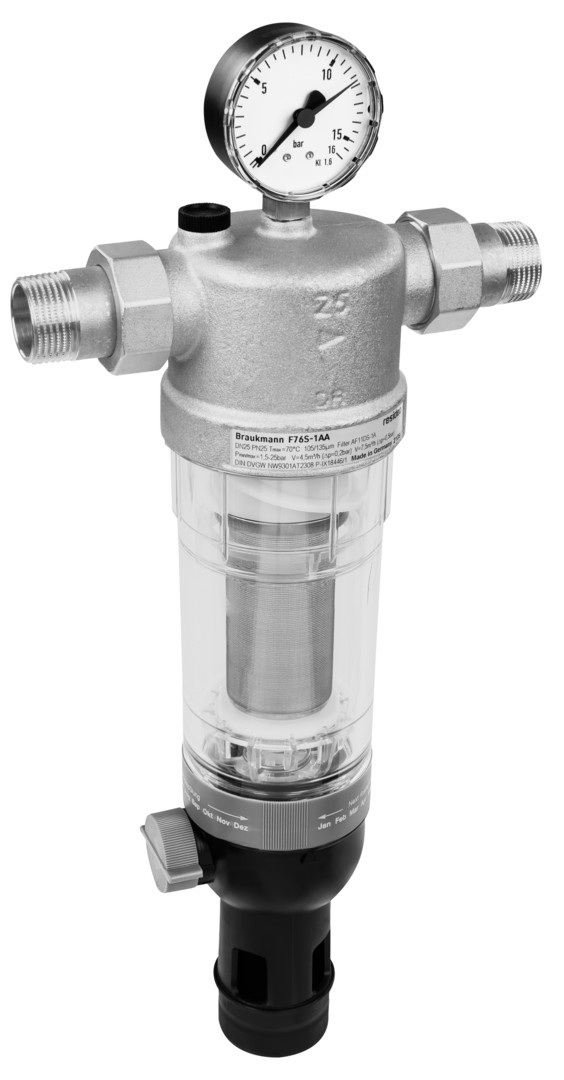 max. Vordruck 16 bar, Gewindetülle, Filterfeinheit 20 µm, ununterbrochene Sicherung der Wasserversorgung mit gefiltertem Wasser, der Feinfilter verhindert das Einspülen von Fremdpartikeln und reduziert die Korrosionswahrscheinlichkeit, das Gerät entspricht den Anforderungen der jeweils gültigen DIN/DVGW Vorgabe, Double Spin Technologie für die Nennweiten 1/2" bis 1 1/4", Kartusche mit außenliegendem Rohr (dadurch gleichzeitige Reinigung von unterem und oberen Filterbereich), visuelle Funktionskontrolle möglich, auch während der Rückspülung Versorgung mit gefiltertem Wasser, Memory-Ring als Hinweis auf die nächstfällige manuelle Rückspülung, Rückspülautomatik mit Bajonett-Anschluss nachrüstbar, große Filterfläche, Filtertasse aus stoßfestem Kunststoff ermöglicht Kontrolle der Filterverschmutzung, Filtereinsatz und komplette Filtertasse austauschbar, normierter Ablaufanschluss, ACS-zertifiziert, alle Materialien gemäß KTW, von TÜV LGA als geräuscharm zugelassen - Gruppe 1 ohne Einschränkungen, Medium Trinkwasser, min. Eingangsdruck 1,5 bar, rückspülbar, Betriebstemperaturbereich 5-30 °C gemäß DIN EN 1567, Ventilkörper aus entzinkungsbeständigem Messing, Rückspülung mit gefiltertem Wasser, Einbaulage horizontal