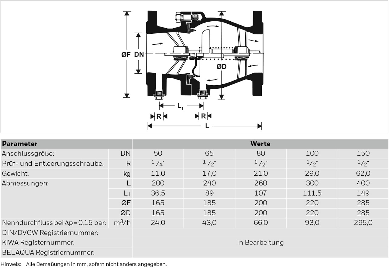 vorzugsweise zur selbständigen Verhinderung des Rückdrückens, Rückfließen und Rücksaugens von Wasser unmittelbar hinter der Wasserzähleranlage, aber auch in Übergabeschächten der Fernwasserversorgung zu verwenden, auch zur Verwendung für gewerbliche, industrielle und ähnliche Trinkwasser-Installationen wo ein Rückdrücken, Rückfließen und Rücksaugen verhindert werden soll, Material bleifrei mit einem Bleianteil kleiner 0,1 %, universeller Einsatzbereich, erzeugt keine Druckstöße, innen und außen pulverbeschichtet, Dichtkegel/Druckfeder und Lippendichtring (aus EPDM) austauschbar, geringer Druckabfall, alle Werkstoffe sind UBA-konform, ACS-zertifiziert, ISO 7005-2, DIN EN 1092-2, Zertifizierungen DVGW, Medium Trinkwasser, Flüssigkeitskategorie (EN 1717) Kategorie 2, max. Mediumstemperatur 65 °C, Ansprechdruck ca. 0,05 bar, max. Vordruck 16 bar, Rohranschluss Flansche