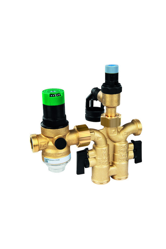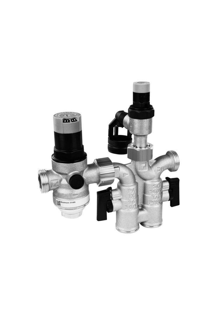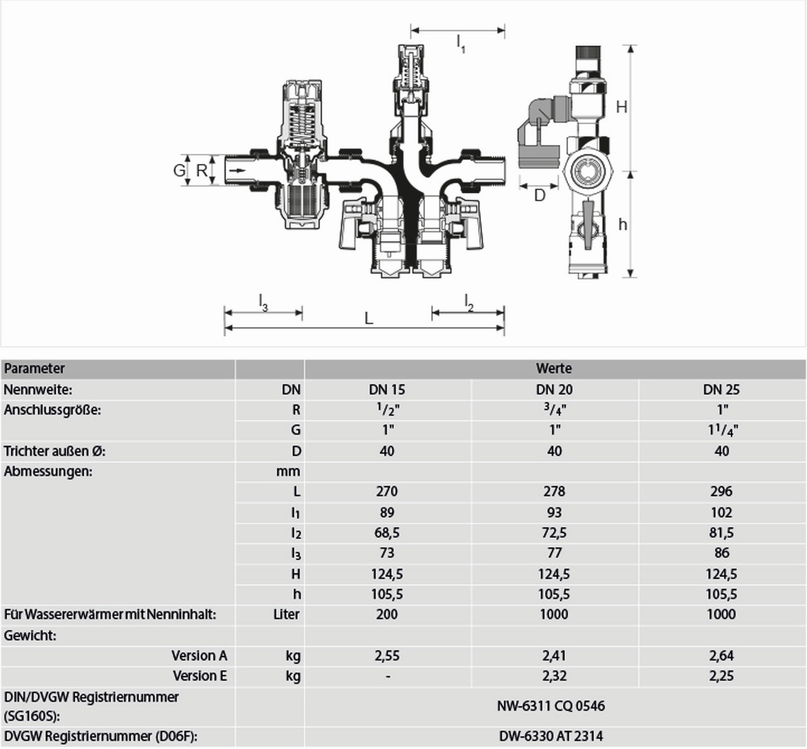 zur Absicherung von druckfesten Warmwasserbereitern nach DIN 4753-1, EN 806-2 und DIN EN 1488, Kompaktarmaturen bei denen alle zur Absicherung geforderten Armaturen wie Rückflussverhinderer, Absperrventil, Prüfstutzen und Membransicherheitsventil und Druckminderer zusammengefasst sind, das Sicherheitsventil schützt den nachgeschalteten Wassererwärmer durch selbsttätiges Öffnen und Schließen, der Rückflussverhinderer verhindert das Rückdrücken, Rückfließen und Rücksaugen von erwärmten Wasser, ein vorgeschalteter Druckminderer mit entlastetem Einsitzventil regelt den Netzwasserdruck auf den erforderlichen Anlagendruck ein, DVGW Zulassung, Medium Trinkwasser, Einbaulage horizontal oder vertikal, Federhaube aus Kunststoff, max. Mediumstemperatur 40 °C, Druck-Bereich 1,5-6 bar, max. Vordruck 16 bar, Mindestdruckgefälle 1 bar, mit Einstellskala, mit Kunststoff-Filtertasse, Sicherheitsgruppe mit Gewindetülle/Rohranschluss Außengewinde