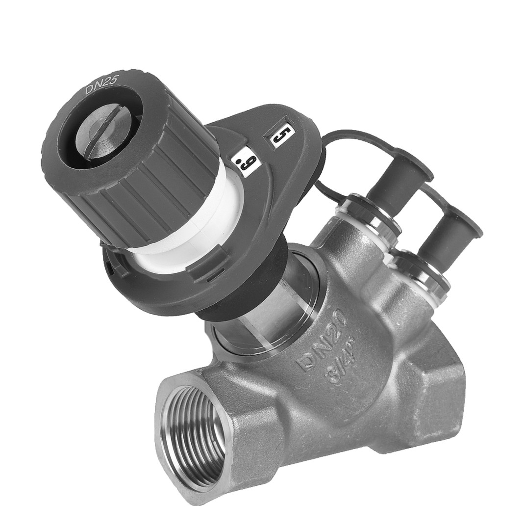mit Safecon Messanschlüssen, zum statischen Abgleich von Gebläsekonvektoren/Klimageräten/Kühldecken und 2-Rohr-Heizsystemen, statisches Ventil mit variabler Drosselöffnung für den Rücklauf mit zusätzlicher Absperrfunktion, Schrägsitz, Medium sind Wasser oder Wasser-Glykol-Gemisch gemäß VDI-Richtlinie 2035, Mediumstemperatur -20 bis +130 °C, stat. Druck PN16, mit Voreinstellung, nummerische Anzeige der Voreinstellung, Rohranschluss Innengewinde, zum Befüllen/Entleeren, mit Mess-Möglichkeit, mit automatischem Abgleich, Anschluss von Zubehör am Ventilschaft-/seitlichem Anschluss, 2-fach Regelung (statischer Abgleich DRV)