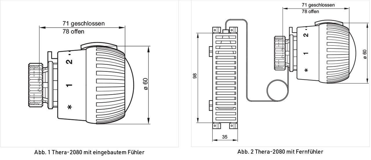 DIN EN 215 geprüft, mit Zertifikat, entspricht den ehemaligen Anforderungen des Bundesamtes für Wehrtechnik und Beschaffung TL 4520-014, Kl. 1, vom Amt für Zivilschutz für den Einsatz in Schutzräumen zugelassen, geeignet für Thermostatventile von Honeywell (seit 1995)/MNG/Heimeier sowie für Oventrop (seit 1999) und Ventilkompakt-Heizkörper mit MNG- oder Heimeier-Ventileinsatz, mit Flüssigkeitselement, Sollwertbereich ca. 6-28 °C Fühlertemperatur bei Nenndurchfluss, nachträglich justierbar, Frostschutz, Blockierung, Begrenzung und Einengung des Sollwertbereiches, optische Kontrolle der individuell gewählten Einstellung durch den Memory-Clip, Modell mit Nullstellung nicht voll absperrbar, entspricht in der Ausführung mit M 30 x 1,5-Anschluss Euronorm DIN EN215 CENCER Zulassung, 11,5 mm Schließmaß