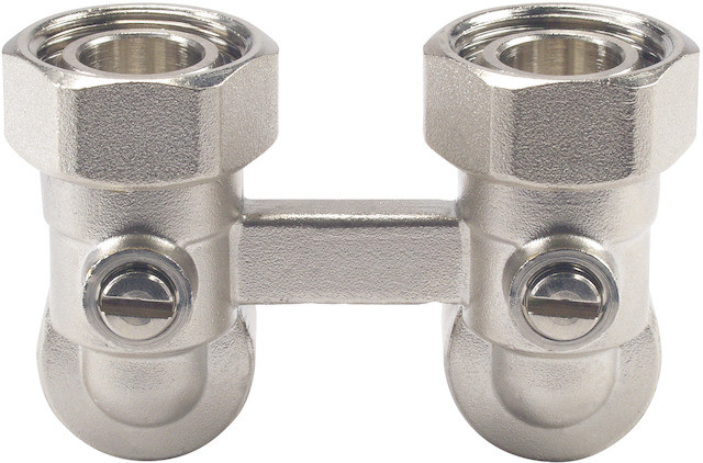 eine Absperrverschraubung für Kompaktheizkörper mit einem Mittenabstand von 50 mm, wird zur Absperrung von einzelnen Heizkörpern mit integrierten Ventilgarnituren in Zweirohr-Anlagen eingesetzt, für Heißwasser-Heizungsanlagen, Ventilgehäuse aus Press-Messing, Kugelventileinsatz aus Messing mit EPDM oder PTFE Dichtungen, mit Einstellbegrenzung, Einbauort Vorlauf und Rücklauf, Medium Wasser, Mediumstemperatur 2-120 °C, stat. Druck PN 10, Achsabstand 50 mm, Nennweite DN 15 mm, Anschlussgewinde 3/4", mit Einstellbegrenzung
