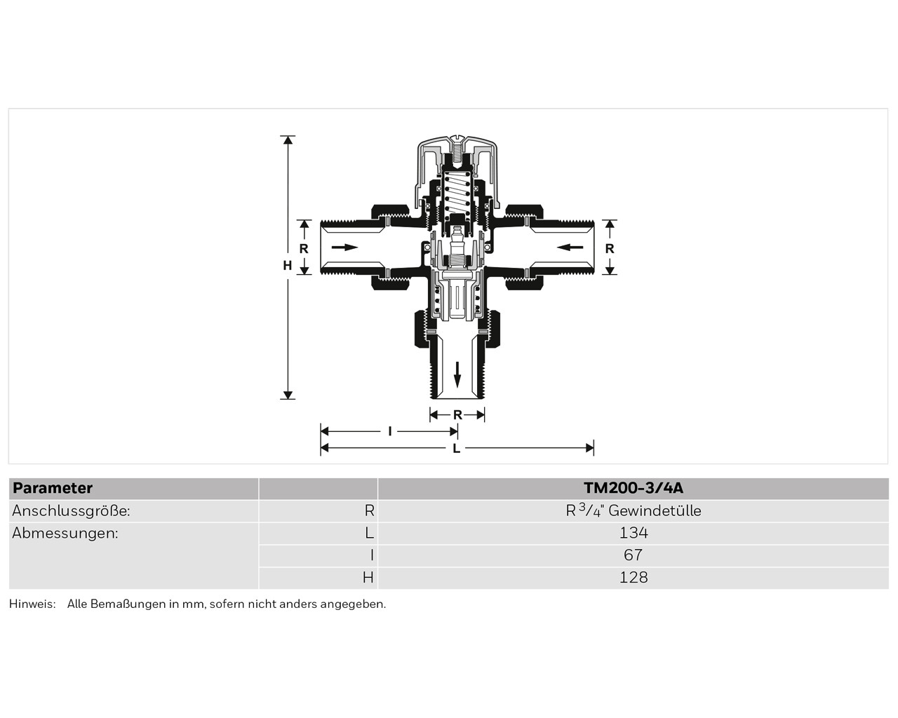 zur Regelung der Wassertemperatur in Warmwasserbereitungsanlagen an zentraler Stelle oder dezentral an der Entnahmestelle in Heizungsanlagen bei Fußbodenheizungen oder zur Begrenzung der Kesselrücklauftemperatur, bei Warmwasserbereitungsanlagen muss in der Zirkulationsleitung eine Kaltwasserbremse eingebaut werden (verhindert dass an Zapfstellen Kaltwasser über die Zirkulationsleitung beigemischt wird), Medium Trinkwasser, Ventilkörper aus entzinkungsbeständigem Messing, Rohranschluss Außengewinde, max. Mediumstemperatur 90 °C, Temperaturbereich 30-60 °C, max. Betriebsdruck 10 bar, Einbaulage horizontal oder vertikal, Temperatur Regelgenauigkeit 4 K