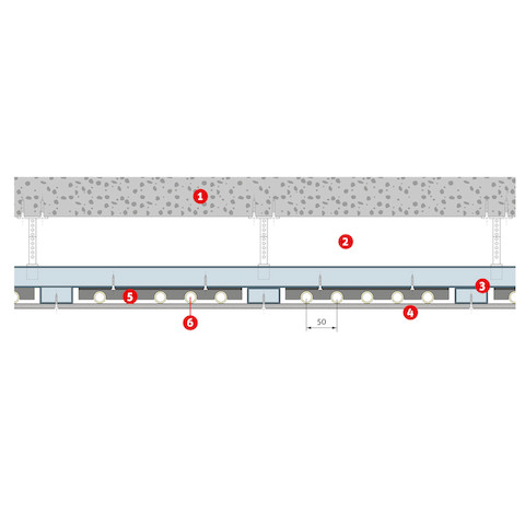 besteht gemäß DIN 14240 aus güteüberwachten und normgerechten Systemkomponenten, als Raumkühlung oder -heizung konzipiert, ermöglicht durch abgestufte Vorort Rohrverlegung die individuelle Anpassung der Kälte- und Wärmestromdichte, Flächengewicht befülltes Rohrsystem ca. 6 kg/m2 (Systemrohr, Montageschiene und Befestigung), Beplankung Gipskartonplatte glatt mit Graphitanteil, Kühlleistung 55 W/m2 bei 8 K, Kühlleistung 70 W/m2 bei 10 K, Heizleistung 87 W/m2 bei 15 K