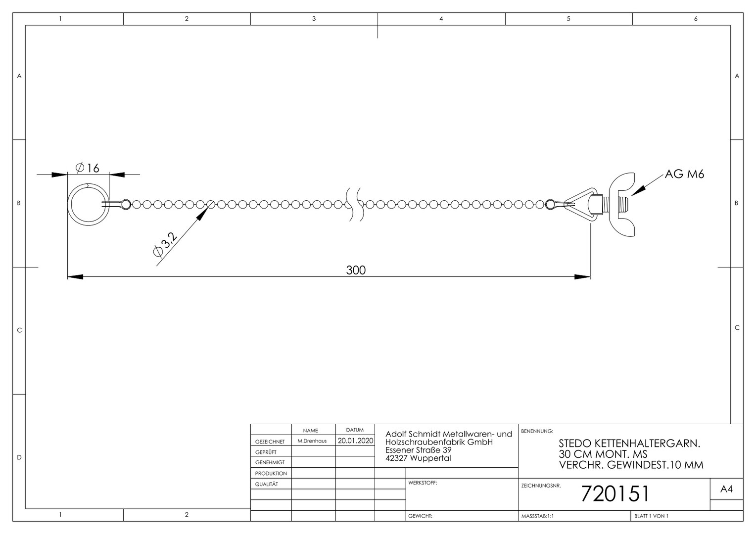 STEDO Kettenhalter Kugelkette Ø 3,2 mm, 300 mm, Gewindestift M6x10mm, Messing verchromt