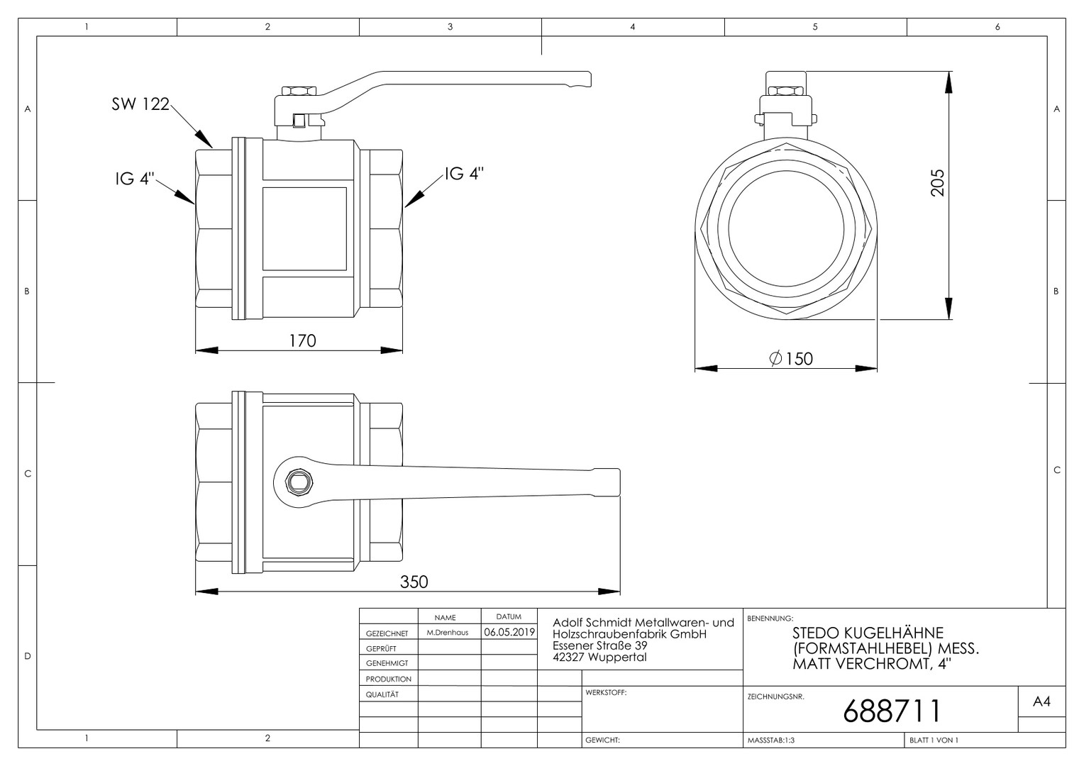 STEDO Kugelhahn Messing matt verchromt, BL 170 mm, IG 4" x IG 4"
