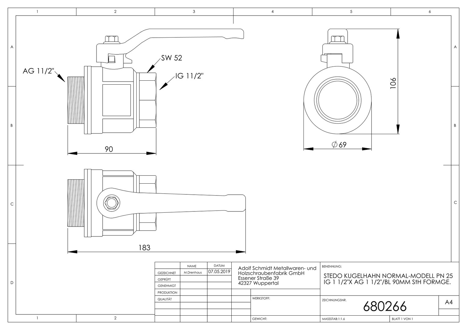 STEDO Kugelhahn Messing matt verchromt, BL 90 mm, IG 1 1/2" x AG 1 1/2"