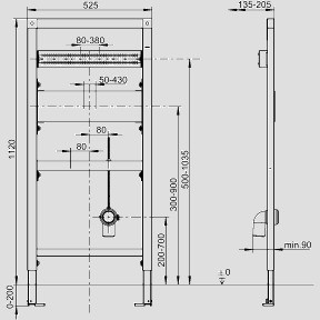 H/B/T: 1120/525/85 mm, Element ist durch verlängerte Füße auf H: 1185 mm einstellbar, selbsttragende, pulverbeschichtete Stahlrahmenkonstruktion, zur Trockenverkleidung, Einbau vor Massivwand, in Leichtbau-Ständerwand u.v.m., 4 Befestigungspunkte, komplett vormontiert, mit Füße und Befestigungsmaterial, universell einstellbar für Ausgussbecken, Breite 525 mm, Verstellbereich Füße von Rohfußboden bis OKFFB: 0-200 mm, Tiefenverstellung Vorderkante Element: 135-205 mm (bei Verwendung von Wandhaltern, Art.-Nr. 17.257.00..T000), mit Ablaufbogen DN 50 (Ø 50) und schallgedämmter Ablaufschelle, mit Gewindestab M 8 x 300 mm, mit 2 wasserfesten mehrfach verleimten Schichtholzplatten, alle Traversen vormontiert