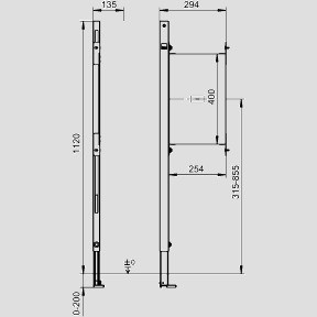 H/B/T: 1120 x 294 x 48, bei rechter als auch linker Bauform, Element ist durch verlängerte Füße auf H: 1185 mm einstellbar, selbsttragende, pulverbeschichtete Stahlkonstruktion, zur Trockenverkleidung, Einbau vor Massivwand, 2 Befestigungspunkte, mit Fuß und Befestigungsmaterial, nicht kürzbar, auch geeignet zur Überbrückung von Elementabständen 500-1100 mm, Verstellbereich Fuß von Rohfußboden bis OKFFB: 0-200 mm, Tiefenverstellung Vorderkante Element: 135-205 mm (bei Verwendung von Wandhaltern Art.-Nr. 17.257.00..T000)
