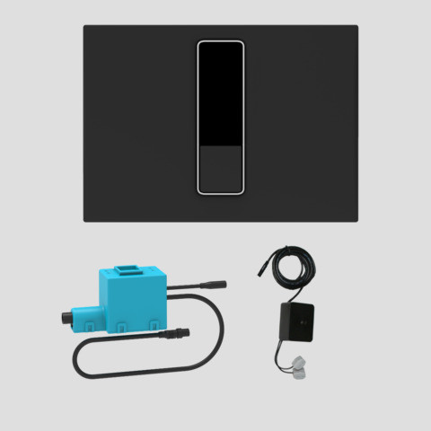 für UP-Spülkasten mit kleiner Revisionsöffnung, Betätigung von vorn, 2-Mengenspülung, hygienische, berührungslose über Infrarotsensor gesteuerte WC-Spüleinrichtung, für WC-Vorwandelemente INEO, Nutzererkennung über Lichtbalken im Sensorfeld, automatisches Auslösen einer Spülung durch Nutzererfassung oder berührungslos mit der Hand, zusätzliche Möglichkeit zur manuellen Spülauslösung uber Betatigungsplatte, bestehend aus Betätigungselement + IR Baustein, inkl. verchromtem Dekorrahmen, Abdeckplatte und Befestigungsbolzen, mit geräuscharmem Niederspannungsmotor als Hebevorrichtung und Steuerelektronik, Spannungseingang: mit Kabel und Stecker für verwechslungssichere Montage, Ausgang: Kabel und codierter Stecker für verwechslungssichere Montage zur Spannungsversorgung, inkl. Kompakt-Netzgerät 230V AC/6V DC , Parameter: 202 x 145 x 10 mm, lange Reichweite ca. 1500 mm, kurze Reichweite ca. 60 mm, Spannungsversorgung 100-240V/AC Netz, definierte Spülmengen einstellbar uber Ablaufarmatur INEO, Spülauslösung: automatisch, berührungslos, manuell, Intervallspülung frei wählbar, werkseitig 24 h, Lichtfarbe fur Nutzererkennung wählbar rot/grün/blau, Parameter Einstellmöglichkeiten über Wartungs- und Service-Fernbedienung DO-5.1 S, Grundparameter direkt an der Betätigungsplatte durch IR-Funktionalitat