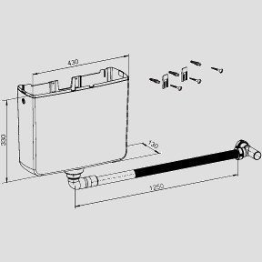 für die Ableitung des Tropfwassers von Handbrausen bei Wannenrandarmaturen, Montage an Massivwänden, für waagerechte Einbindung in Überlaufrohre von Badewannenablaufarmaturen ø 32, bestehend aus Schlauchkasten mit drehbarem flexiblen Ablaufrohr, Abzweig DN 32 (ø 32 mm), Rückschlagklappe, Befestigungsmaterial und Montageanleitung