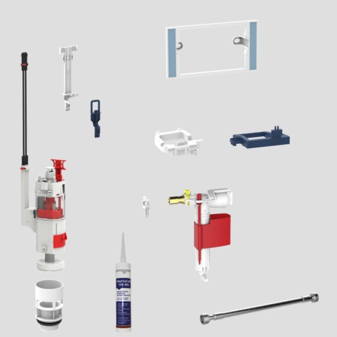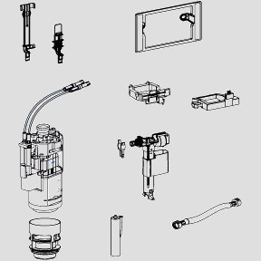 bestehend aus: Ablaufarmatur INEO, Bodenventil, Füllventil 510, Füllventilhalter, Niederhalter, Aussteifungsbrücke, flexibler Anschlussschlauch G 3/8, Montagekleber und Befestigungsrahmen zur Montage von Betätigungsplatten für kleine Revisionsöffnung (außer BTP LIS)