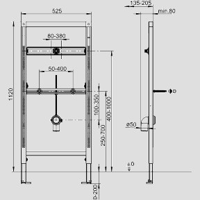 für Keramiken mit integrierten Steuerungen, H/B/T: 1120/525/80 mm, Element ist durch verlängerte Füße auf H: 1185 mm einstellbar, selbsttragende, pulverbeschichtete Stahlrahmenkonstruktion, zur Trockenverkleidung, Einbau vor Massivwand, in Leichtbau-Ständerwand u.v.m., 4 Befestigungspunkte, komplett vormontiert, mit Füße und Befestigungsmaterial, universell einstellbar für Urinalkeramik, Verstellbereich Füße von Rohfußboden bis OKFFB: 0-200 mm, Tiefenverstellung Vorderkante Element: 135-205 mm (bei Verwendung von Wandhaltern, Art.-Nr. 17.257.00..T000), mit 1 schallgedämmten Wanddurchführung, G 1/2 IG/G 1/2 AG, mit 2 Urinalbefestigungsbolzen M 8 mit Bauschutz und verchromten Abdeckungen, mit Ablaufbogen DN 50 (Ø 50) und schallgedämmter Ablaufschelle, mit Gewindestab M 8 x 300 mm, alle Traversen vormontiert, ohne Aufputzdruckspüler