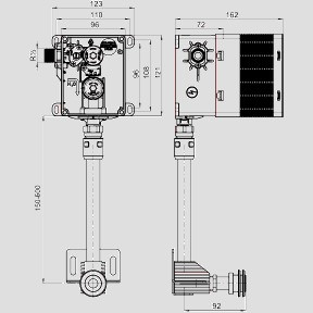 universell einsetzbares Kartuschen-Rohbauset für Nassbau in Kompaktbauweise für handbetätigtes pneumatisches Kartuschenventil, oder für Kartuschen-Magnetventil 6 V DC für Infrarot-Elektronik, relative Leitfähigkeit oder HF-Technik, Kunststoff-Rohbaugehäuse B/H/T 96 x 122 x 72 mm, mit vormontierter revisionierbarer Wasserstrecke, mit Vorabsperrung, mit Befestigungsmaterial, Fließdruck 1-10 bar, Geräuschklasse I, Bauschutzkasten für Revisionsöffnung kürzbar, universeller Wasseranschluss R 1/2, Filter- und Ventilkappe mit 8 mm Innensechskant, mit Spülrohr 500 mm AD 20 mm bauseits kürzbar (Mitte Rohbaukasten – Mitte Urinaleingang von hinten max. 610 mm/min. 210 mm, mit Spülrohrumlenkung und Fixierblech, mit Zulaufrohr 180 mm AD 20 mm bauseits kürzbar, mit Urinal-Zulaufgarnitur bestehend aus: Spülrohr und Spülrohrverbinder für Keramikdurchmesser 32-38 mm