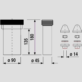 Kunststoff PE, schweißbar, für Wand-WC, bestehend aus: WC-Anschlussrohr Ø 45 mm mit Spülrohrverbinder, WC-Anschlussstutzen DN 90 und Abdeckzubehör, Prüfzeichen: geprüft nach DIN 1389