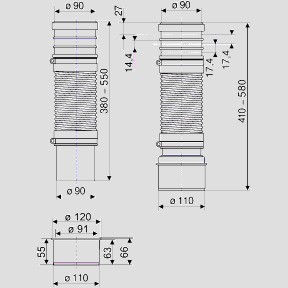 aus Kunststoff PE, schweißbar, für Montagesituationen im UP-Bereich sowie für Ecklösungen und Schachtanschlüsse, mit Übergangsstück DN 90/DN 100, L= 410-580 mm