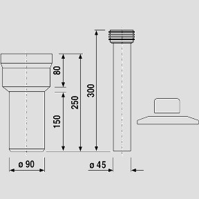speziell geeignet für den Anschluss von Kinder-WCs, passend auch für Geberit-Baby-WC 211650, bestehend aus: WC-Anschlussstutzen DN 90, 250 mm, mit Flachrosette DN 90, WC-Anschlussrohr Ø 44 mm x 300 mm, Spülrohrverbinder und Abdeckrosette, CV-Verbindergummi Ø 70 mm, für WC-Abgangsstutzen < Ø 100 mm