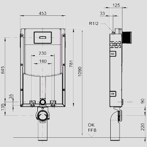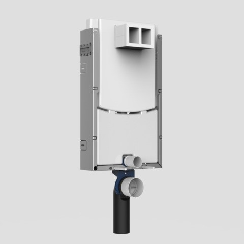 Betätigung von vorn, zum Ein- oder Vormauern vor Massivwand, bestehend aus einem verzinkten u-förmigen Element mit 6 Befestigungslaschen, WC-Befestigungsmaterial M 12, mit vormontiertem schwitzwasserisolierten UP-Spülkasten (CC-121-S-FO-2V-2C) mit 2-Mengenspülung (7,5 bis 4,5 l/4 bis 2 l), Werkseinstellung 6 und 3 l, Übertragung der Tastenfunktion über flexible Kabeltechnik zur INEO Ablaufgarnitur, Verbindung zur Betätigungsplatte über Dreh-Klick-Verbindung, Füllventil Armaturengruppe I, 2-teiliges Eckventil-Anschlussset R 1/2, Befestigungsschelle für Ablaufbogen 4-fach verstellbar, WC-Anschlussbogen 90° DN 90 (Ø 90)/mit Übergangsmuffe DN 90 (Ø 90)/DN 100 (Ø 110) mit Bauschutz, WC-Anschlussgarnitur DN 90 (Ø 90), Bauschutzkasten für Revisionsöffnung kürzbar, flexibler Schlauch zum Füllventil von Hand verschraubbar, Befestigungsmaterial komplett, mit Füllblock, ohne Betätigungsplatte