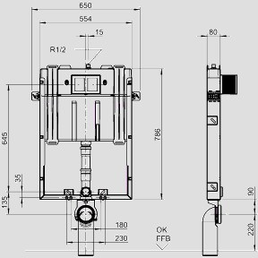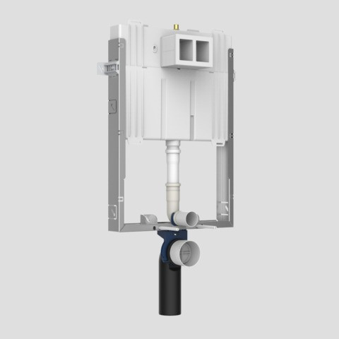 Betätigung von vorn, zum Ein-oder Vormauern vor Massivwand, bestehend aus einem verzinkten u-förmigen Element mit 6 Befestigungspunkten, WC-Befestigungsmaterial M 12, mit vormontiertem schwitzwasserisolierten UP-Spülkasten (CC-80-SFO- 2V-2C), Bautiefe 8 cm, mit 2-Mengenspülung (6 bis 4 l/4 bis 2 l), Werkseinstellung 6 und 3 l, Füllventil Armaturengruppe I, 2-teiliges Eckventil-Anschlussset R 1/2, Befestigungsschelle für Ablaufbogen 4-fach verstellbar, WC-Anschlussbogen 90° DN 90 (Ø 90) mit Bauschutz, Bauschutzkasten für Revisionsöffnung kürzbar, Befestigungsmaterial und Armierungsgewebe, ohne Betätigungsplatte