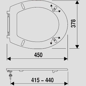 Thermoplast-Massiv-WC-Sitz, seniorengerecht und einsetzbar in Altenheimen, Pflege- und Klinikbereichen, sitzwarm, gerade Unterseite, Seitenstabilität durch 2 verstellbare Spezial-Puffer, passend auf genormte Wand- und Stand-WCs, Prüfzeichen: geprüft nach DIN 19516