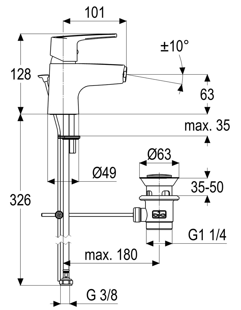Kartusche 35 mm offen, mit Heißwasser- und Durchflussbegrenzer, Werkstoffe nach TrinkwV und UBA, Hebel Metall, Flexschläuche 3/8" DIN DVGW, Strahlregler Durchflussklasse A, schwenkbar, Geräuschprüfzeichen P-IX 7199/IZ, für Sitzwaschbecken, Ablaufgarnitur 1 1/4", mit Befestigungssatz