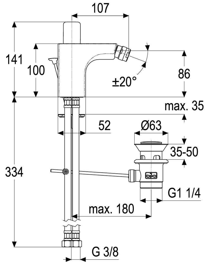 Schulte Bidet-Einhebelmischer alpha-style_600 Ausladung 110mm, mit Ablaufgarnitur, seitengesteuert, verchromt