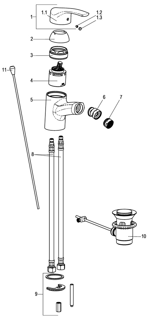Kartusche 44 mm, mit Heißwasser- und Durchflussbegrenzer, Werkstoffe nach TrinkwV und UBA, Hebel Metall, Flexschläuche 3/8" DIN DVGW, Strahlregler Durchflussklasse A, mit Kugelgelenk, für Sitzwaschbecken, Ablaufgarnitur 1 1/4", mit Befestigungssatz