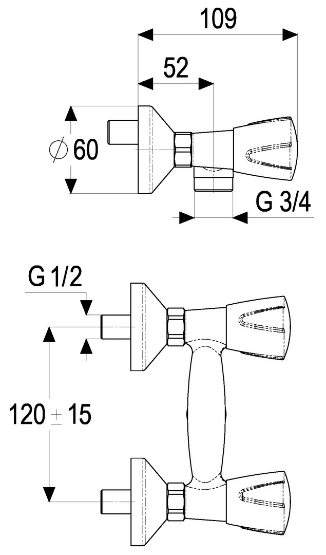 Schulte Brause-Zweigriff-Armatur classic-line_2 3/8", ohne Brausegarnitur, Stichmaß 105-135mm, verchromt, Trianongriff W327166