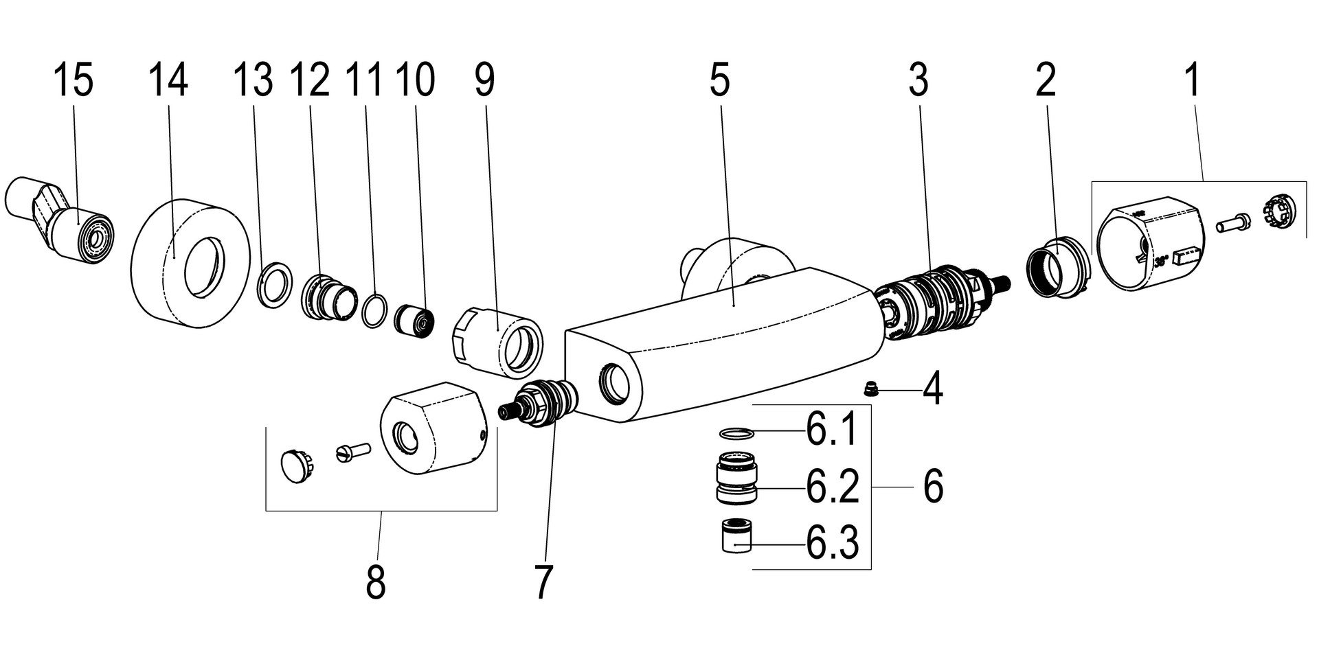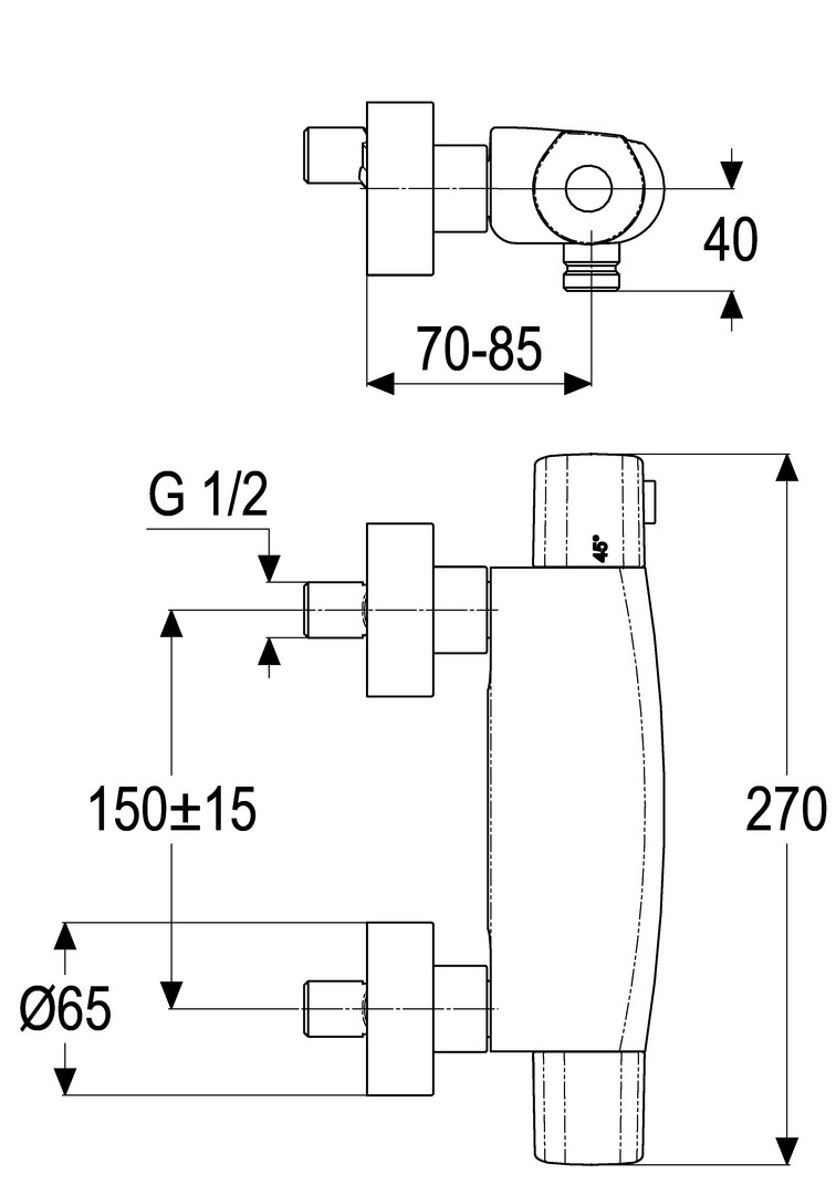 Brauseabgang 1/2", Thermoelement und Keramikoberteil, Werkstoffe nach TrinkwV und UBA, für Wandmontage, eigensicher gegen Rückfließen, mit Wassermengenbegrenzung, verdeckte S-Anschlüsse, Durchlauferhitzer geeignet, Temperaturwählgriff, Heißwassersperre bei 38 °C